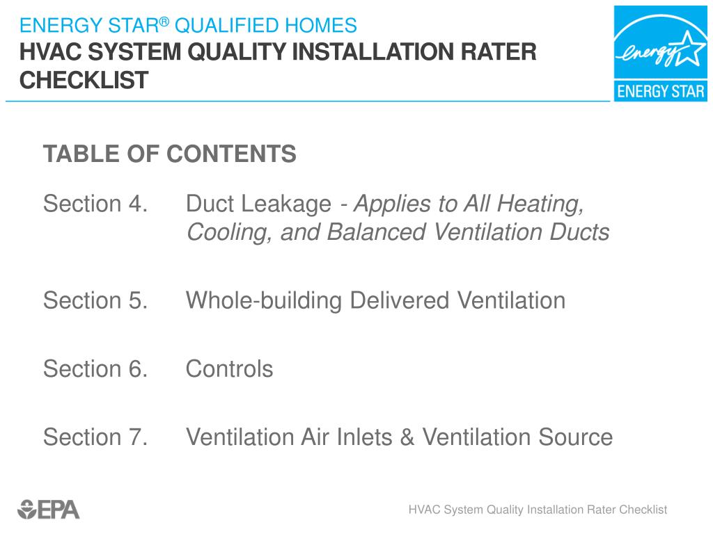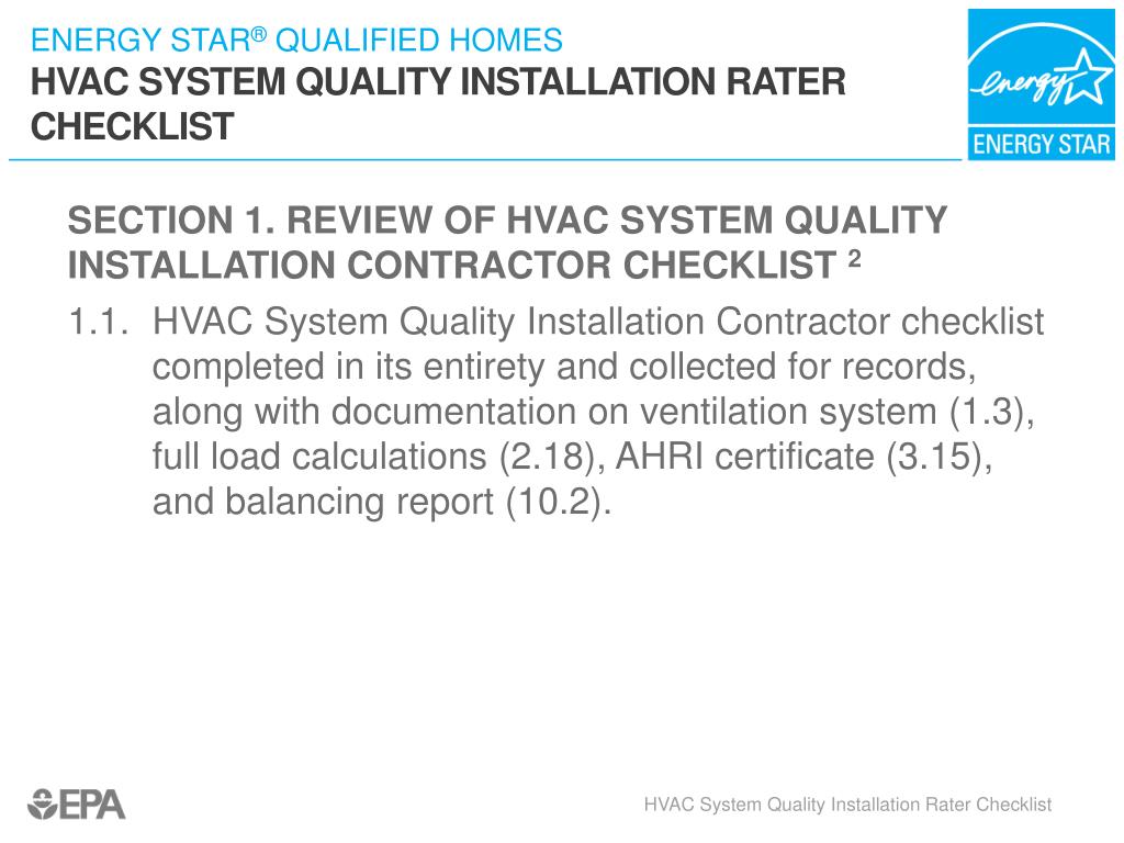 ENERGY STAR Qualified Homes. HVAC SYSTEM QUALITY INSTALLATION RATER CHECKLIST 1. TABLE OF CONTENTS . Section 1. Review of HVAC System Quality Installation Contractor Checklist 2