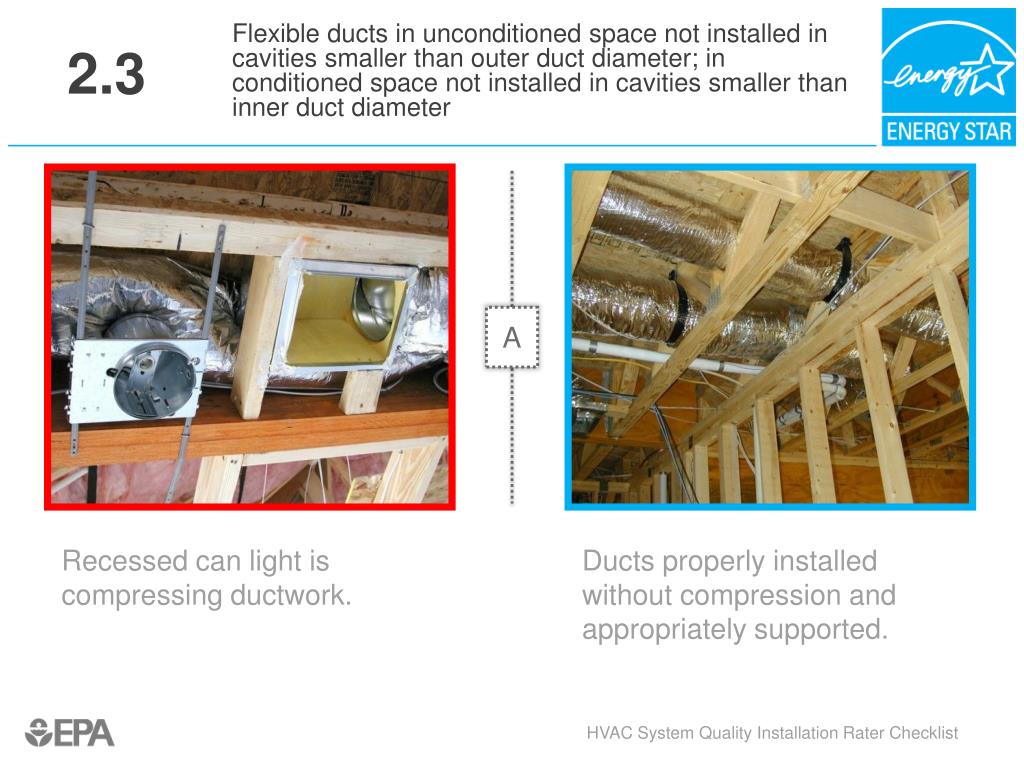 2.3 Flexible ducts in unconditioned space not installed in cavities smaller than outer duct diameter; in conditioned space not installed in cavities smaller than inner duct diameter A Recessed can light is compressing ductwork. HVAC System Quality Installation Rater Checklist Ducts properly installed without compression and appropriately supported.