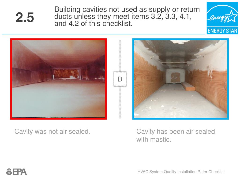 2.5 Building cavities not used as supply or return ducts unless they meet items 3.2, 3.3, 4.1, and 4.2 of this checklist. D Cavity was not air sealed. HVAC System Quality Installation Rater Checklist Cavity has been air sealed with mastic.