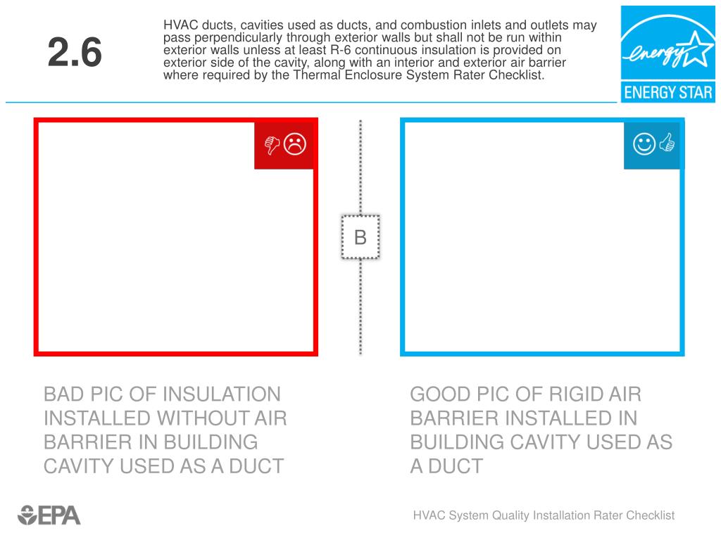 2.6 HVAC ducts, cavities used as ducts, and combustion inlets and outlets may pass perpendicularly through exterior walls but shall not be run within exterior walls unless at least R-6 continuous insulation is provided on exterior side of the cavity, along with an interior and exterior air barrier where required by the Thermal Enclosure System Rater Checklist. B BAD PIC OF INSULATION INSTALLED WITHOUT AIR BARRIER IN BUILDING CAVITY USED AS A DUCT HVAC System Quality Installation Rater Checklist GOOD PIC OF RIGID AIR BARRIER INSTALLED IN BUILDING CAVITY USED AS A DUCT