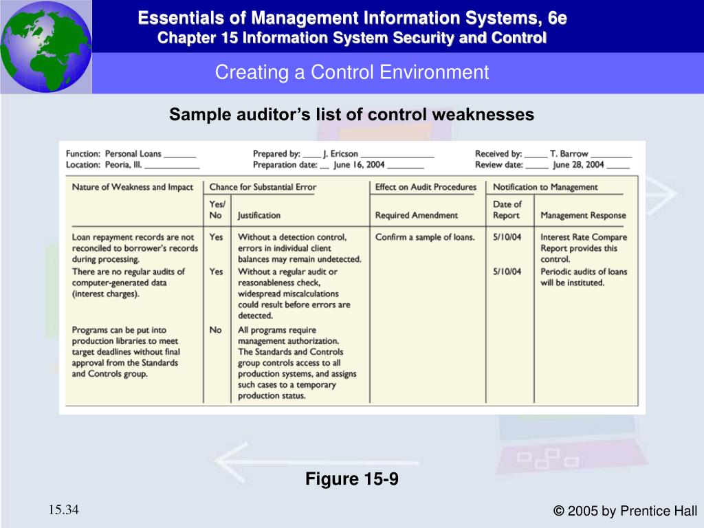Creating a Control Environment Sample auditor’s list of control weaknesses Figure 15-9