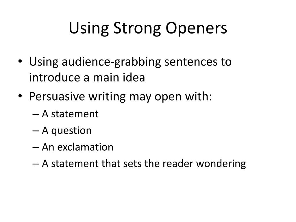 Using Strong Openers • Using audience-grabbing sentences to introduce a main idea • Persuasive writing may open with: • A statement • A question • An exclamation • A statement that sets the reader wondering