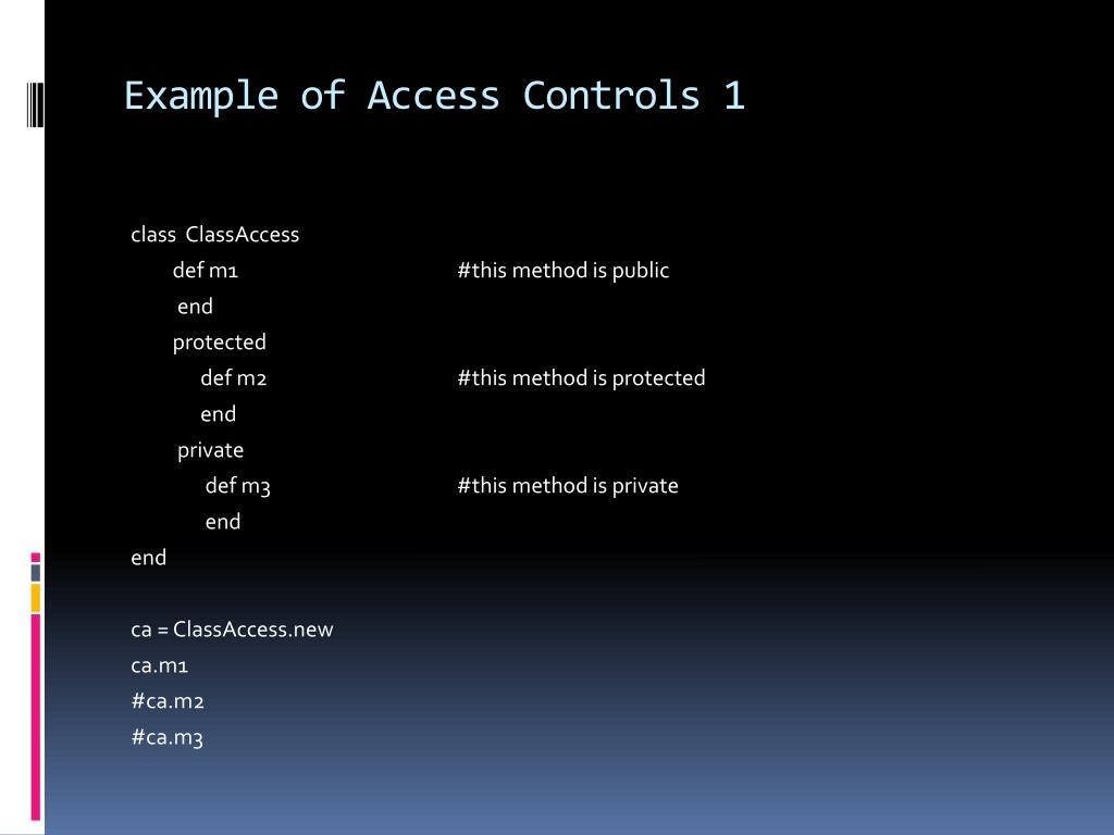 Example of Access Controls 1 class ClassAccess def m1 #this method is public end protected def m2 #this method is protected end private def m3 #this method is private end end ca = ClassAccess.new ca.m1 #ca.m2 #ca.m3