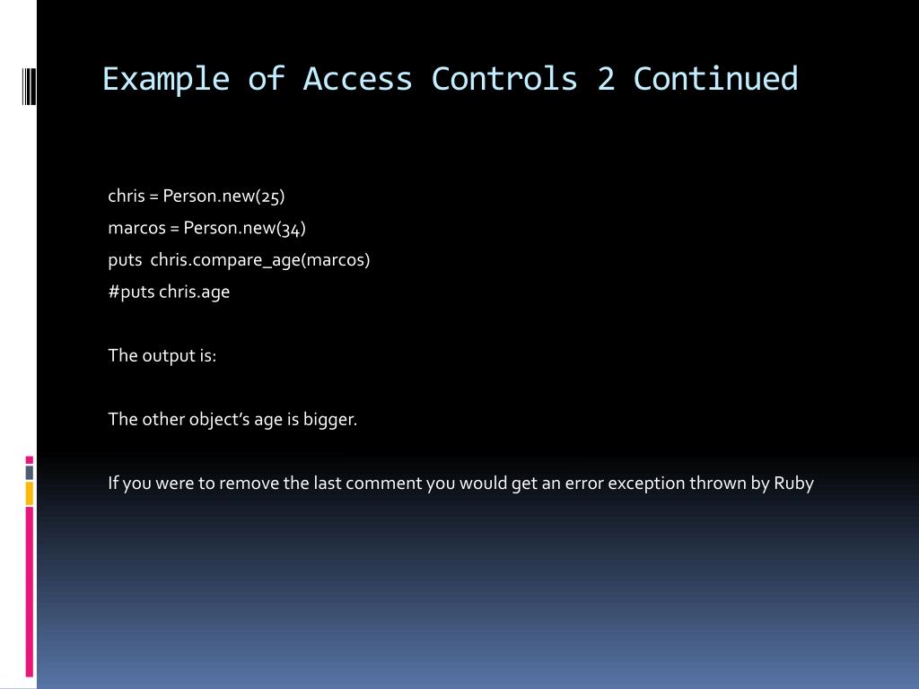 Example of Access Controls 2 Continued chris = Person.new(25) marcos = Person.new(34) puts chris.compare_age(marcos) #puts chris.age The output is: The other object’s age is bigger. If you were to remove the last comment you would get an error exception thrown by Ruby