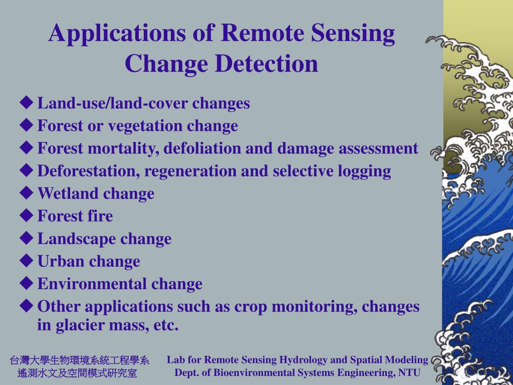 Because of the advantages of repetitive data acquisition, its synoptic view, and digital format suitable for computer processing, remotely sensed data have become the major data sources for different change detection applications during the past decades. 台灣大學生物環境系統工程學系 Lab for Remote Sensing Hydrology and Spatial Modeling 遙測水文及空間模式研究室 Dept. of Bioenvironmental Systems Engineering, NTU