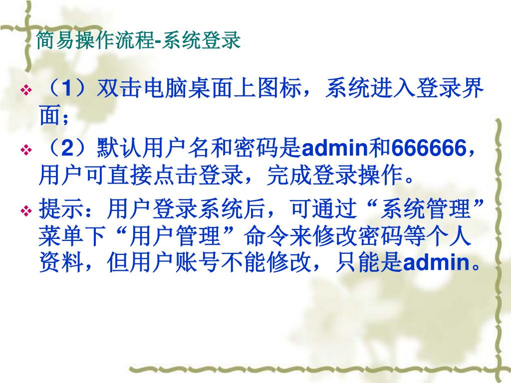 简易操作流程-系统登录 • (1)双击电脑桌面上图标,系统进入登录界面; • (2)默认用户名和密码是admin和666666,用户可直接点击登录,完成登录操作。 • 提示:用户登录系统后,可通过“系统管理”菜单下“用户管理”命令来修改密码等个人资料,但用户账号不能修改,只能是admin。