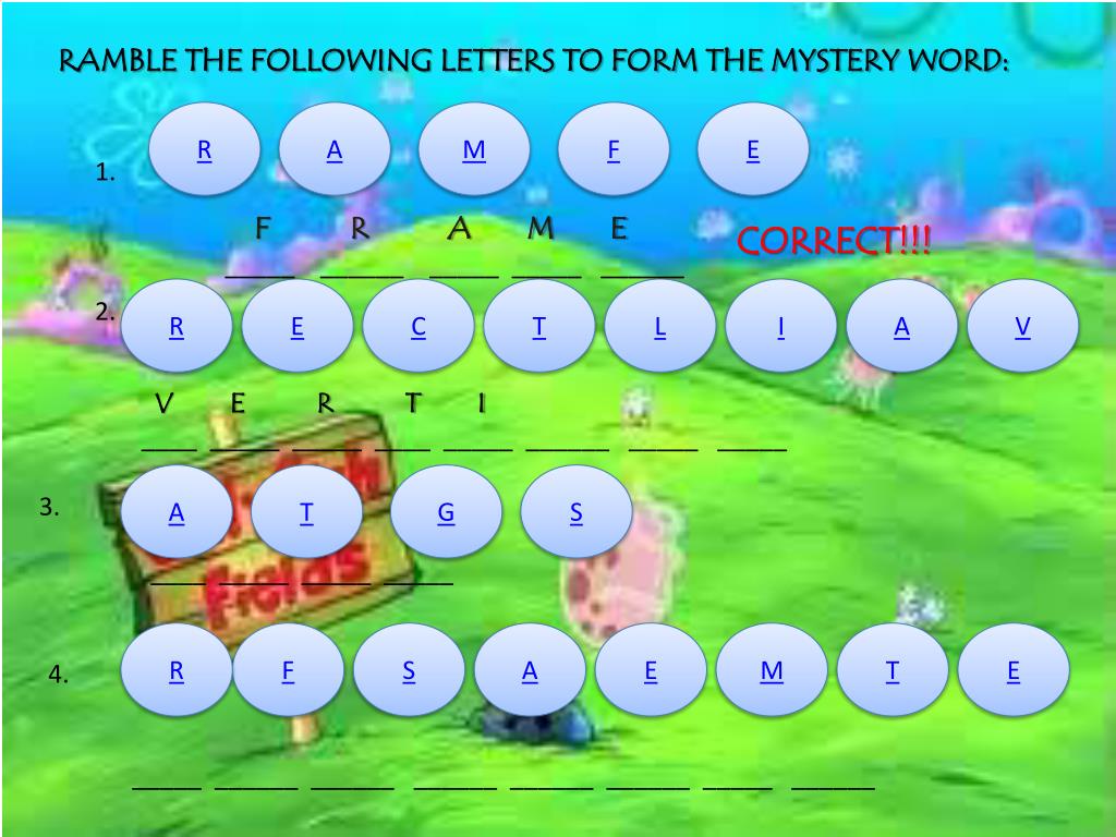 RAMBLE THE FOLLOWING LETTERS TO FORM THE MYSTERY WORD: R A M F E 1. F R A M E _____ ______ _____ _____ ______ CORRECT!!! R E C T L I A V 2. V E R T I C A ____ _____ _____ ____ _____ ______ _____ _____ A T G S 3. ____ _____ _____ _____ R F S A E M T E 4. _____ ______ ______ ______ ______ ______ _____ ______