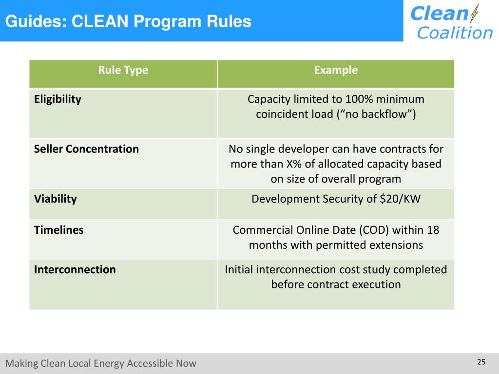 CLEAN Programs Defined CLEAN = Clean Local Energy Accessible Now CLEAN Program Features: • Procurement: Standard and guaranteed contract between the utility and a renewable energy facility owner to purchase 100% of generation at a predefined rate for a long duration • Interconnection: Predictable, streamlined distribution grid access • Financing: Low-risk contracts will attract lower-interest financing