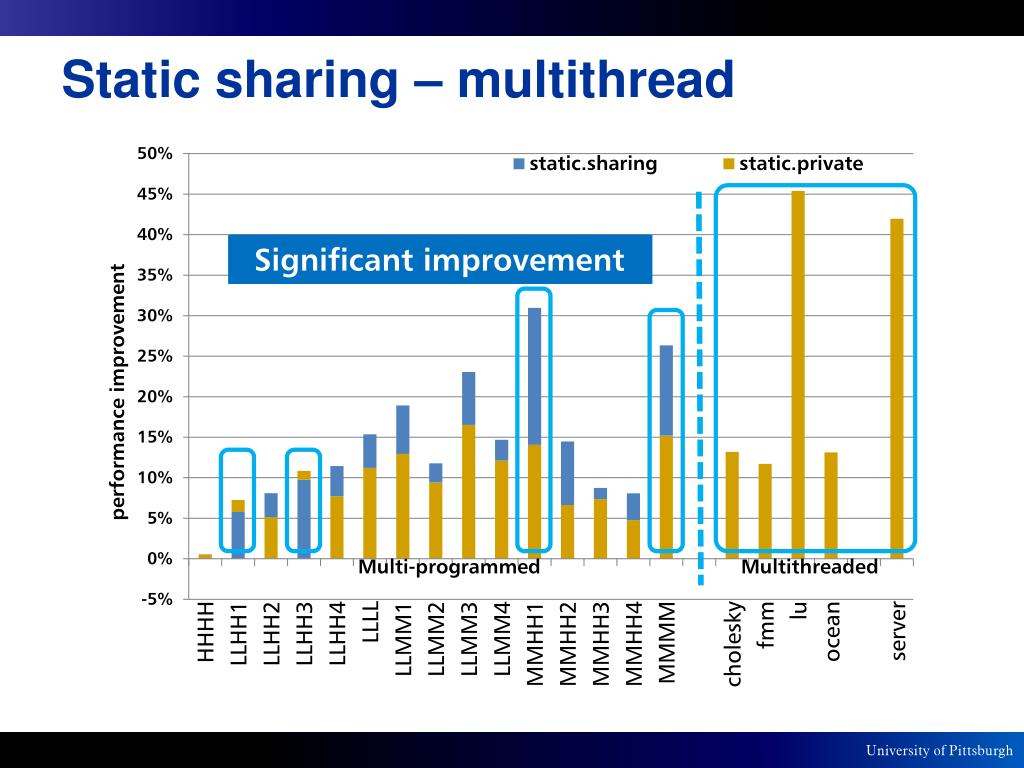 Static sharing – multithread Capacity interference Multithreaded workloads Significant improvement Multi-programmed Multithreaded