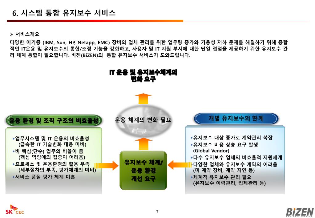 유지보수 체계/ 운용 환경 개선 요구 6. 시스템 통합 유지보수 서비스 • 서비스개요 • 다양한 이기종 (IBM, Sun, HP, Netapp, EMC) 장비와 업체 관리를 위한 업무량 증가와 가용성 저하 문제를 해결하기 위해 종합적인 IT운용 및 유지보수의 통합/조정 기능을 강화하고, 사용자 및 IT 지원 부서에 대한 단일 접점을 제공하기 위한 유지보수 관리 체계 통합이 필요합니다. 비젠(BiZEN)의 통합 유지보수 서비스가 도와드립니다. IT 운용 및 유지보수체계의변화 요구 운용 체계의 변화 필요 개별 유지보수의 한계 운용 환경 및 조직 구조의 비효율성 • 유지보수 대상 증가로 계약관리 복잡 • 유지보수 비용 상승 요구 발생(Global Vendor) • 다수 유지보수 업체의 비효율적 지원체계 • 다양한 업체와 유지보수 계약의 어려움(미 계약 장비, 계약 지연 등) • 체계적 유지보수 관리 필요(유지보수 이력관리, 업체관리 등) • 업무시스템 및 IT 운용의 비효율성(급속한 IT 기술변화 대응 미비) • 비 핵심(단순) 업무의 비율이 큼(핵심 역량에의 집중이 어려움) • 프로세스 및 운용환경의 활용 부족(세부절차의 부족, 평가체계의 미비) • 서비스 품질 평가 체계 미흡