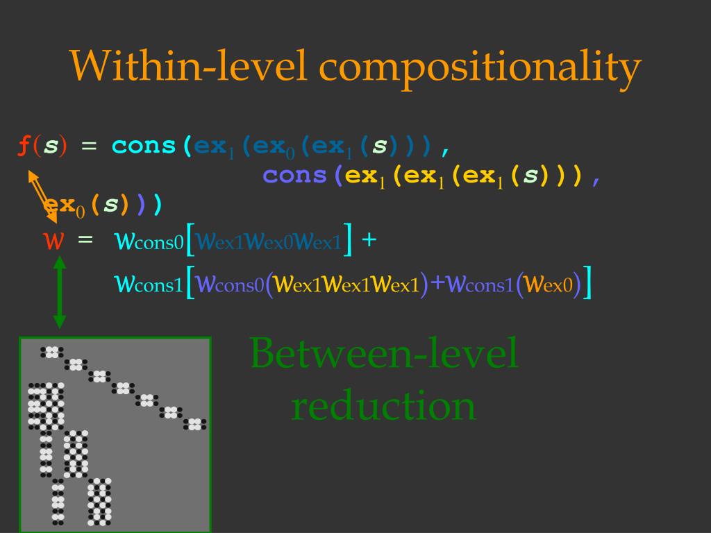 Within-level compositionality W = Wcons0[Wex1Wex0Wex1] +Wcons1[Wcons0(Wex1Wex1Wex1)+Wcons1(Wex0)] ƒ(s) = cons(ex1(ex0(ex1(s))),cons(ex1(ex1(ex1(s))),ex0(s))) Between-level reduction