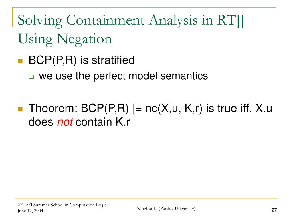 Solving Containment Analysis in RT[] Using Negation • BCP(P,R) is stratified • we use the perfect model semantics • Theorem: BCP(P,R) |= nc(X,u, K,r) is true iff. X.u does not contain K.r Ninghui Li (Purdue University)