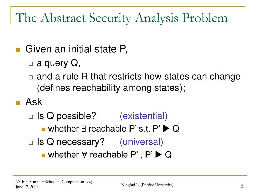 The Abstract Security Analysis Problem • Given an initial state P, • a query Q, • and a rule Rthat restricts how states can change (defines reachability among states); • Ask • Is Q possible? (existential) • whether reachable P’ s.t. P’ Q • Is Q necessary? (universal) • whether reachable P’ , P’ Q Ninghui Li (Purdue University)