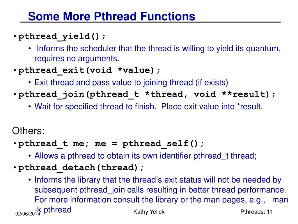 Some More Pthread Functions • pthread_yield(); • Informs the scheduler that the thread is willing to yield its quantum, requires no arguments. • pthread_exit(void *value); • Exit thread and pass value to joining thread (if exists) • pthread_join(pthread_t *thread, void **result); • Wait for specified thread to finish. Place exit value into *result. Others: • pthread_t me; me = pthread_self(); • Allows a pthread to obtain its own identifier pthread_t thread; • pthread_detach(thread); • Informs the library that the thread’s exit status will not be needed by subsequent pthread_join calls resulting in better thread performance. For more information consult the library or the man pages, e.g., man -k pthread Kathy Yelick