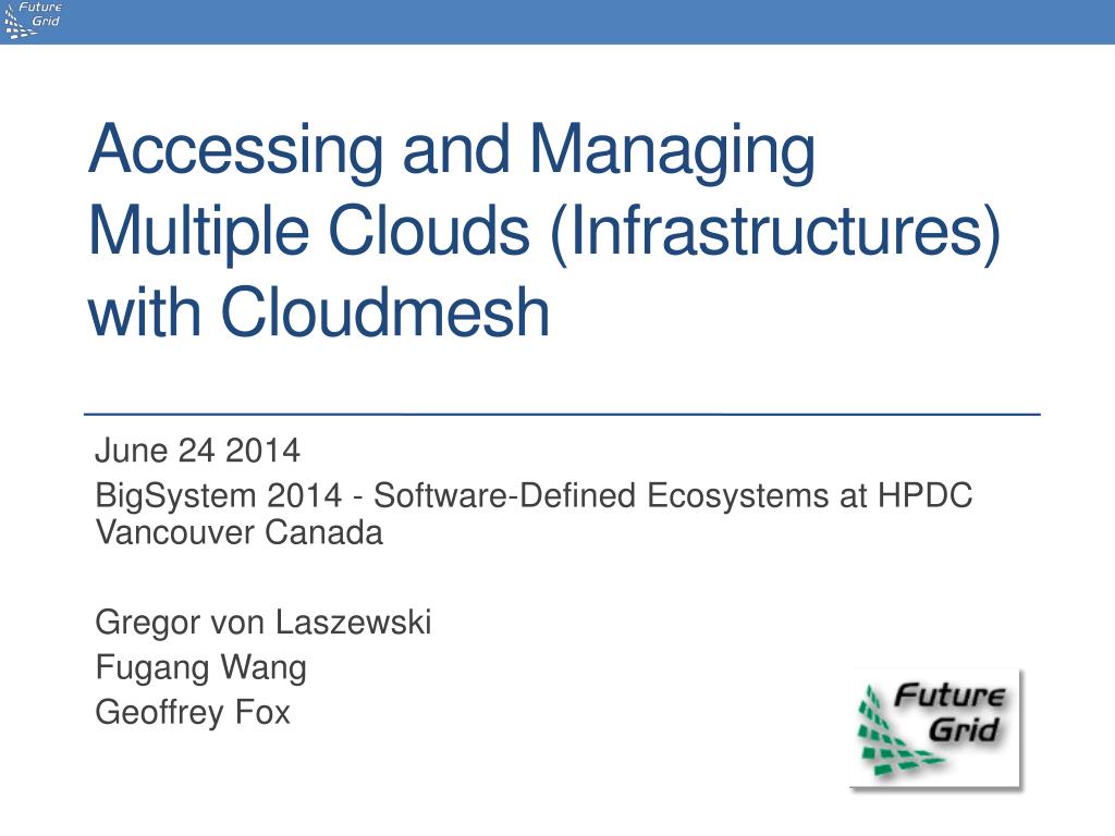 Accessing and Managing Multiple Clouds (Infrastructures) with Cloudmesh June 24 2014 BigSystem 2014 - Software-Defined Ecosystems at HPDC Vancouver Canada Gregor von Laszewski Fugang Wang Geoffrey Fox