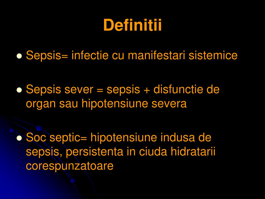Definitii • Sepsis= infectie cu manifestari sistemice • Sepsis sever = sepsis + disfunctie de organ sau hipotensiune severa • Soc septic= hipotensiune indusa de sepsis, persistenta in ciuda hidratarii corespunzatoare