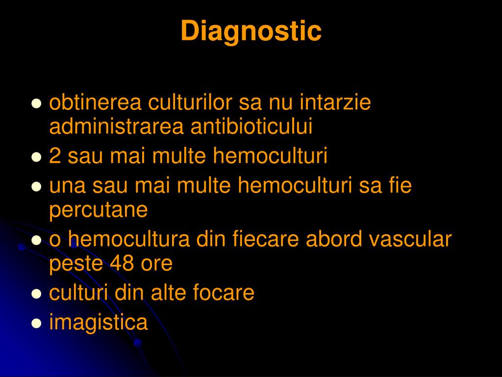 Diagnostic • obtinerea culturilor sa nu intarzie administrarea antibioticului • 2 sau mai multe hemoculturi • una sau mai multe hemoculturi sa fie percutane • o hemocultura din fiecare abord vascular peste 48 ore • culturi din alte focare • imagistica