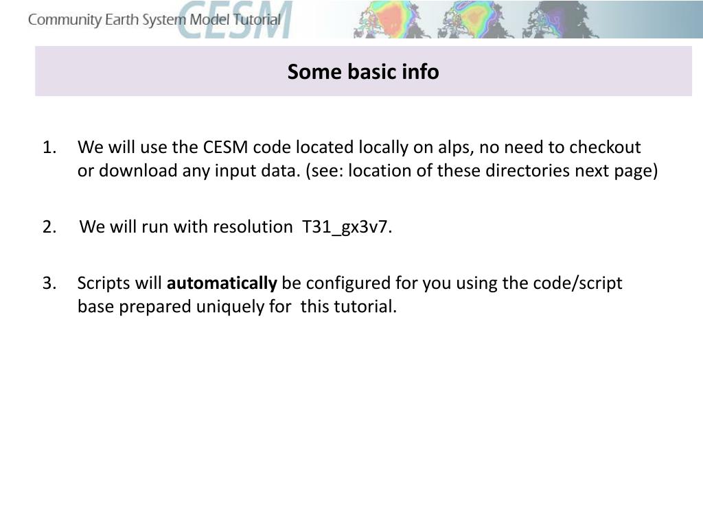 Some basic info • We will use the CESM code located locally on alps, no need to checkout or download any input data. (see: location of these directories next page) 2. We will run with resolution T31_gx3v7. • Scripts will automatically be configured for you using the code/script base prepared uniquely for this tutorial.