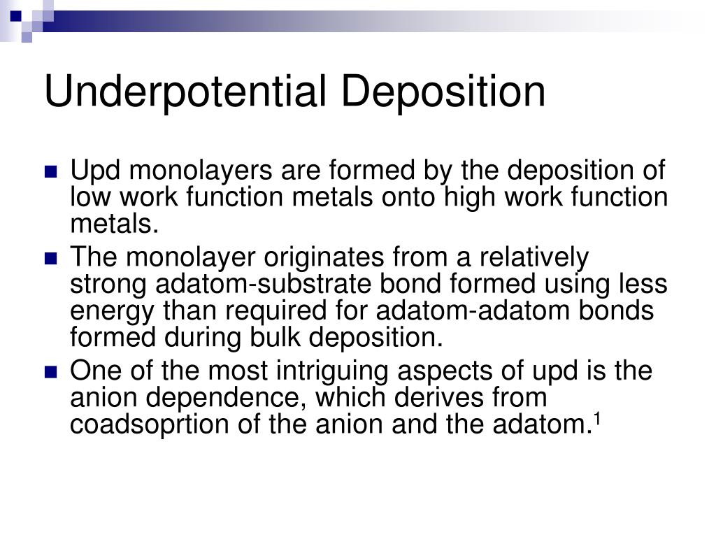 Underpotential Deposition • The electrodeposition of a metal on a foreign metal at potentials less negative than the equilibrium potential of the deposition reaction. Such a process is energetically unfavorable and it can occur only because of a strong interaction between the two metals, with their interaction energy changing the overall energetics to favorable. Consequently, only one (very seldom two) monolayer can be deposited this way, and this is a very convenient way to produce well-controlled monolayer deposits.12