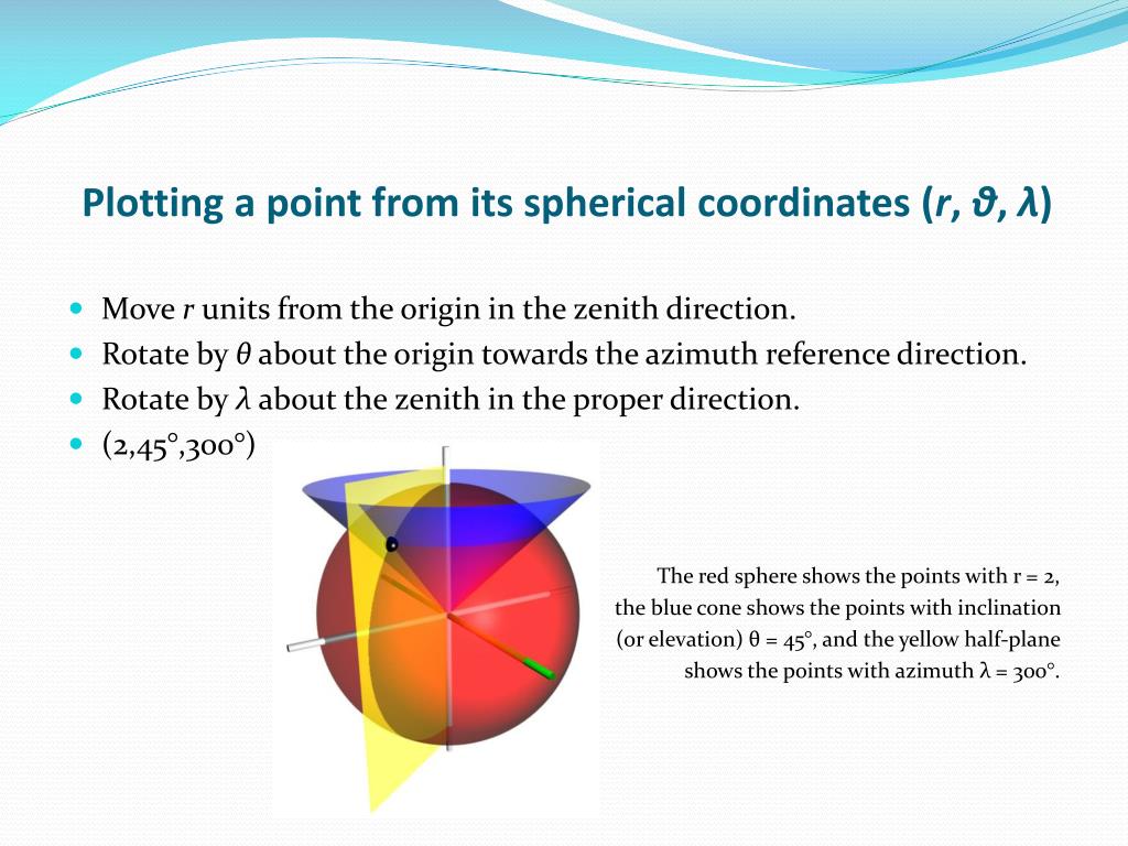 Plotting a point from its spherical coordinates (r, θ, λ) • Move r units from the origin in the zenith direction. • Rotate by θ about the origin towards the azimuth reference direction. • Rotate by λ about the zenith in the proper direction. • (2,45°,300°) The red sphere shows the points with r = 2, the blue cone shows the points with inclination (or elevation) θ = 45°, and the yellow half-plane shows the points with azimuth λ = 300°.
