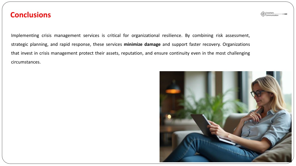 9. Implementing crisis management services is critical for organizational resilience. By combining risk assessment, strategic planning, and rapid response, these services minimize damage and support faster recovery. Organizations that invest in crisis management protect their assets, reputation, and ensure continuity even in the most challenging circumstances. Conclusions