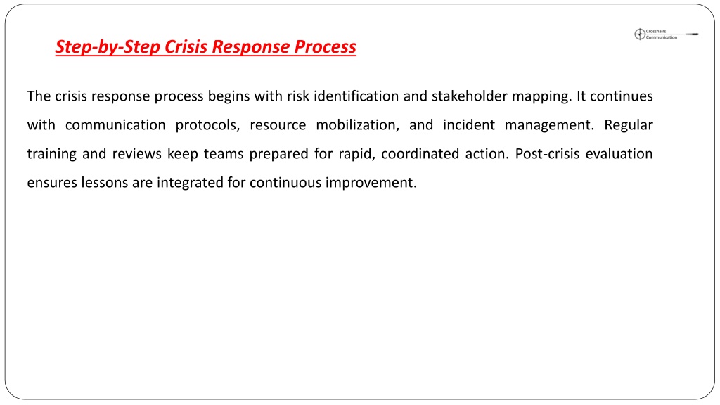 7. The crisis response process begins with risk identification and stakeholder mapping. It continues with communication protocols, resource mobilization, and incident management. Regular training and reviews keep teams prepared for rapid, coordinated action. Post-crisis evaluation ensures lessons are integrated for continuous improvement. Step-by-Step Crisis Response Process