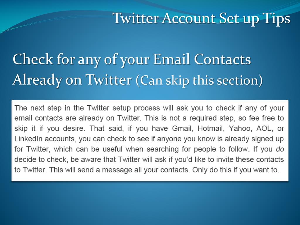 Twitter Account Set up Tips Check for any of your Email Contacts Already on Twitter (Can skip this section)