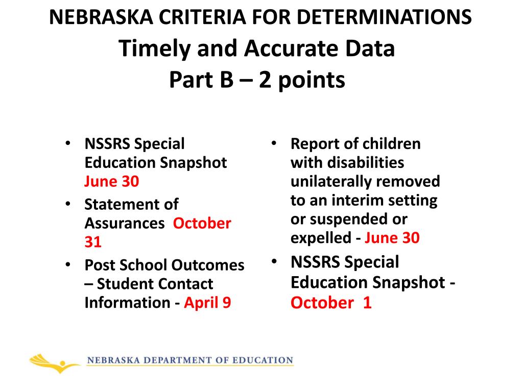 NEBRASKA CRITERIA FOR DETERMINATIONSTimely and Accurate Data Part B – 2 points NSSRS Special Education Snapshot June 30 Statement of Assurances October 31 Post School Outcomes – Student Contact Information - April 9 Report of children with disabilities unilaterally removed to an interim setting or suspended or expelled - June 30 NSSRS Special Education Snapshot -October 1