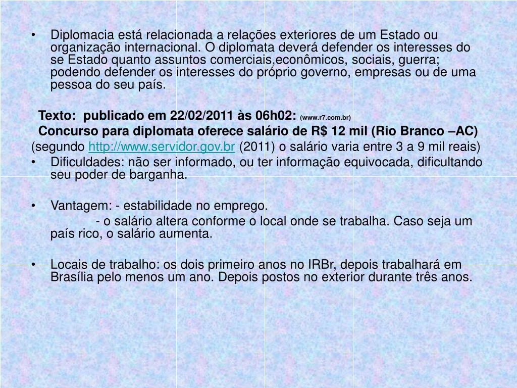 Diplomacia está relacionada a relações exteriores de um Estado ou organização internacional. O diplomata deverá defender os interesses do se Estado quanto assuntos comerciais,econômicos, sociais, guerra; podendo defender os interesses do próprio governo, empresas ou de uma pessoa do seu país. Texto: publicado em 22/02/2011 às 06h02: (www.r7.com.br) Concurso para diplomata oferece salário de R$ 12 mil (Rio Branco –AC) (segundo http://www.servidor.gov.br (2011) o salário varia entre 3 a 9 mil reais) • Dificuldades: não ser informado, ou ter informação equivocada, dificultando seu poder de barganha. • Vantagem: - estabilidade no emprego. - o salário altera conforme o local onde se trabalha. Caso seja um país rico, o salário aumenta. • Locais de trabalho: os dois primeiro anos no IRBr, depois trabalhará em Brasília pelo menos um ano. Depois postos no exterior durante três anos.
