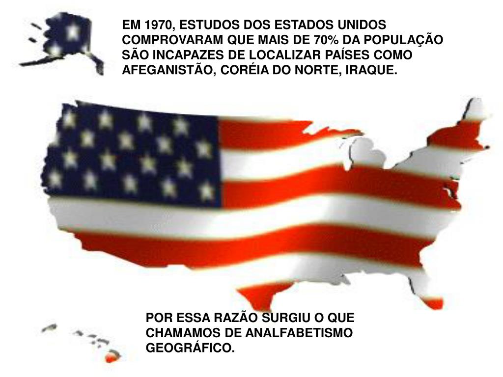 EM 1970, ESTUDOS DOS ESTADOS UNIDOS COMPROVARAM QUE MAIS DE 70% DA POPULAÇÃO SÃO INCAPAZES DE LOCALIZAR PAÍSES COMO AFEGANISTÃO, CORÉIA DO NORTE, IRAQUE. POR ESSA RAZÃO SURGIU O QUE CHAMAMOS DE ANALFABETISMO GEOGRÁFICO.