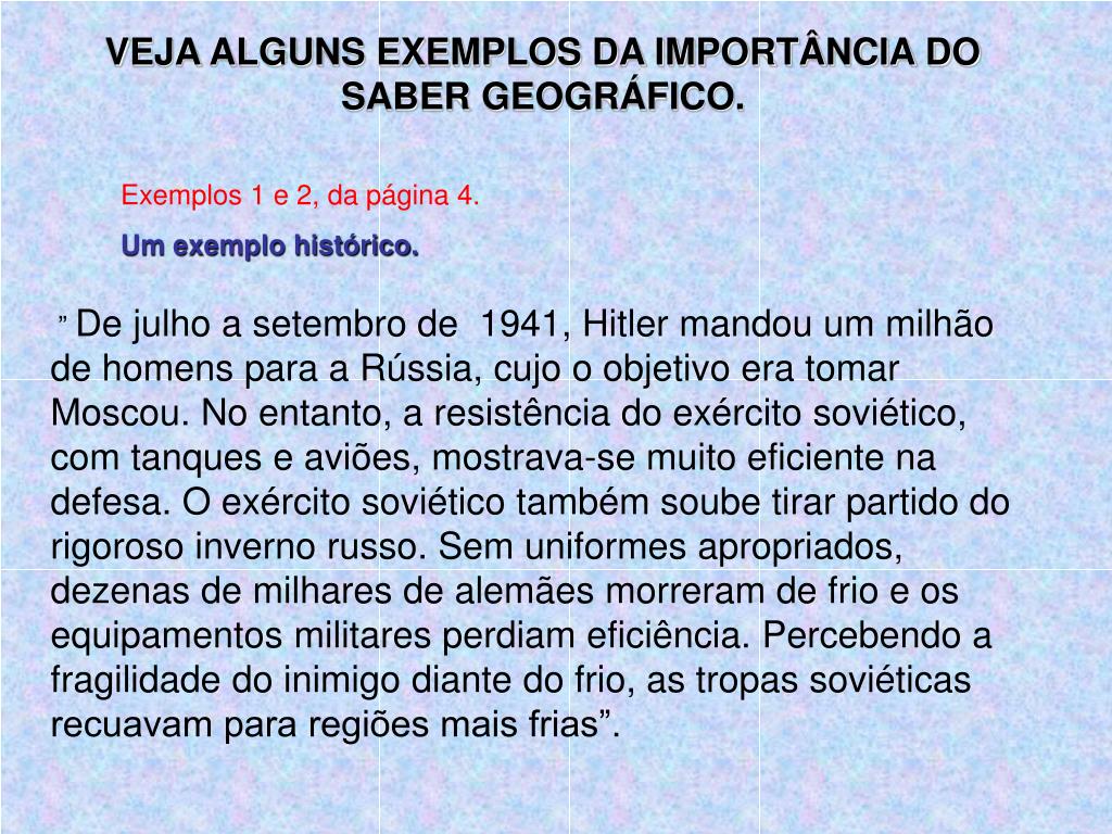 VEJA ALGUNS EXEMPLOS DA IMPORTÂNCIA DO SABER GEOGRÁFICO. Exemplos 1 e 2, da página 4. Um exemplo histórico. ” De julho a setembro de 1941, Hitler mandou um milhão de homens para a Rússia, cujo o objetivo era tomar Moscou. No entanto, a resistência do exército soviético, com tanques e aviões, mostrava-se muito eficiente na defesa. O exército soviético também soube tirar partido do rigoroso inverno russo. Sem uniformes apropriados, dezenas de milhares de alemães morreram de frio e os equipamentos militares perdiam eficiência. Percebendo a fragilidade do inimigo diante do frio, as tropas soviéticas recuavam para regiões mais frias”.
