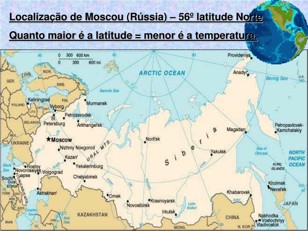 Localização de Moscou (Rússia) – 56º latitude Norte Quanto maior é a latitude = menor é a temperatura.