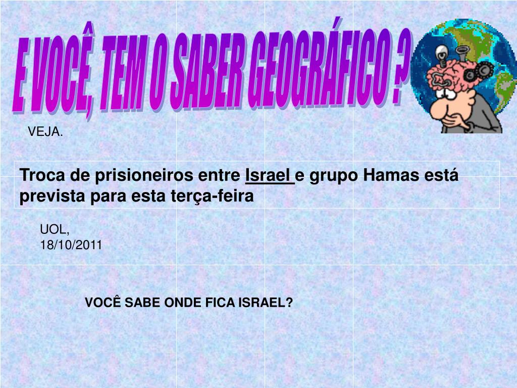 E VOCÊ, TEM O SABER GEOGRÁFICO ? VEJA. Troca de prisioneiros entre Israel e grupo Hamas está prevista para esta terça-feira UOL, 18/10/2011 VOCÊ SABE ONDE FICA ISRAEL?
