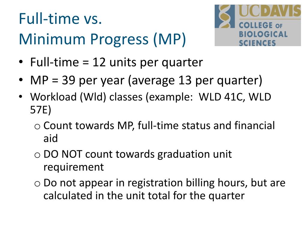 Full-time vs. Minimum Progress (MP) • Full-time = 12 units per quarter • MP = 39 per year (average 13 per quarter) • Workload (Wld) classes (example: WLD 41C, WLD 57E) • Count towards MP, full-time status and financial aid • DO NOT count towards graduation unit requirement • Do not appear in registration billing hours, but are calculated in the unit total for the quarter