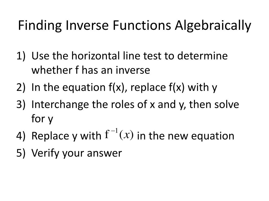 Finding Inverse Functions Algebraically • Use the horizontal line test to determine whether f has an inverse • In the equation f(x), replace f(x) with y • Interchange the roles of x and y, then solve for y • Replace y with in the new equation • Verify your answer