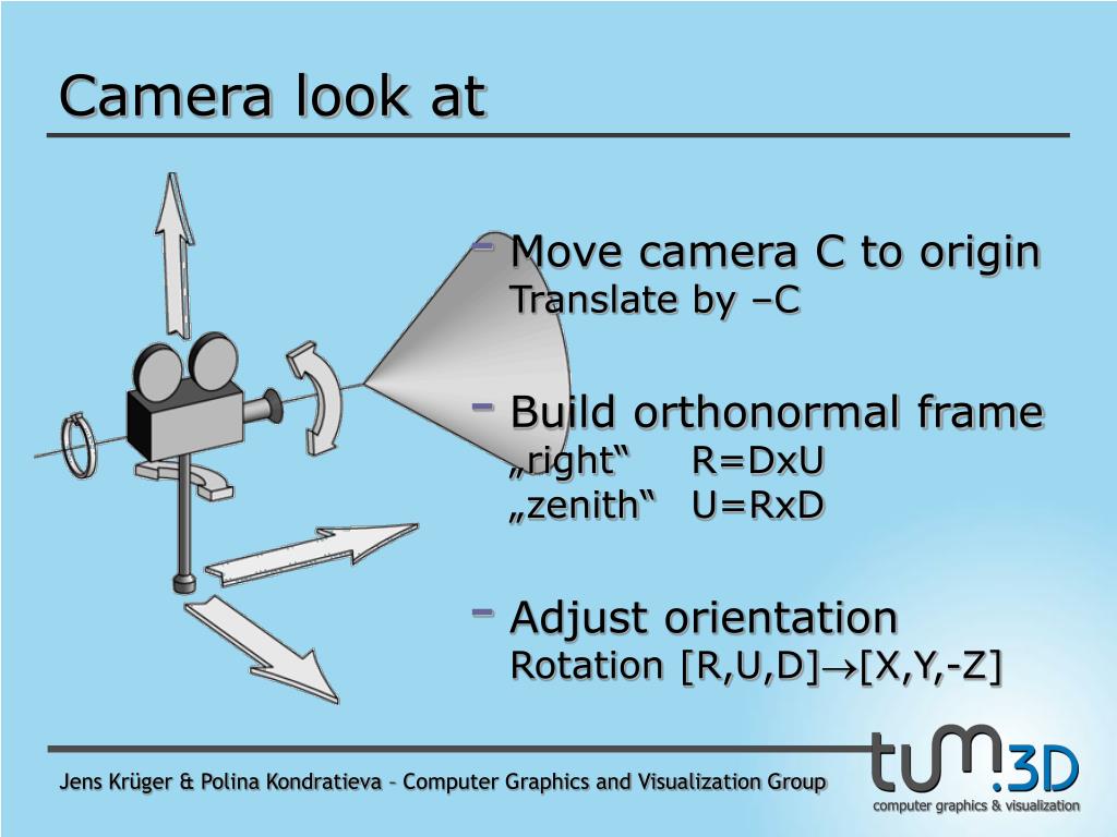 Camera look at • Move camera C to originTranslate by –C • Build orthonormal frame„right“ R=DxU„zenith“ U=RxD • Adjust orientationRotation [R,U,D][X,Y,-Z] Jens Krüger & Polina Kondratieva – Computer Graphics and Visualization Group