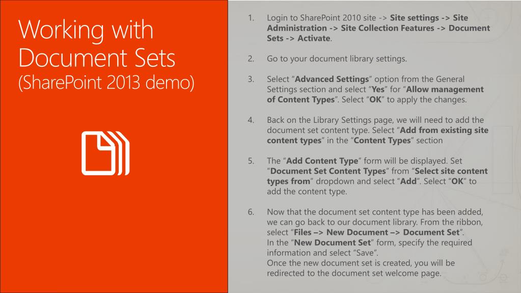 Working with Document Sets(SharePoint 2013 demo) Login to SharePoint 2010 site -> Site settings -> Site Administration -> Site Collection Features -> Document Sets -> Activate. Go to your document library settings. Select “Advanced Settings” option from the General Settings section and select “Yes” for “Allow management of Content Types”. Select “OK” to apply the changes. Back on the Library Settings page, we will need to add the document set content type. Select “Add from existing site content types” in the “Content Types” section The “Add Content Type” form will be displayed. Set “Document Set Content Types” from “Select site content types from” dropdown and select “Add”. Select “OK” to add the content type. Now that the document set content type has been added, we can go back to our document library. From the ribbon, select “Files –> New Document –> Document Set”.In the “New Document Set” form, specify the required information and select “Save”.Once the new document set is created, you will be redirected to the document set welcome page.