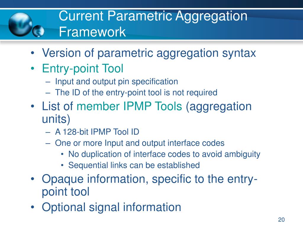 Parametric Infrastructure • Cases in which the tools required may not be unique • Tools are based on popular public algorithms • A wide variety of equivalent implementations are available • Computationally intensive tools leading to platform-specific optimized implementations form a wide variety of venders • A set of parameters and values are to be identified and standardized to support a specific class of functionality • Parametric Representation • Parametric Description • Parametric Aggregation