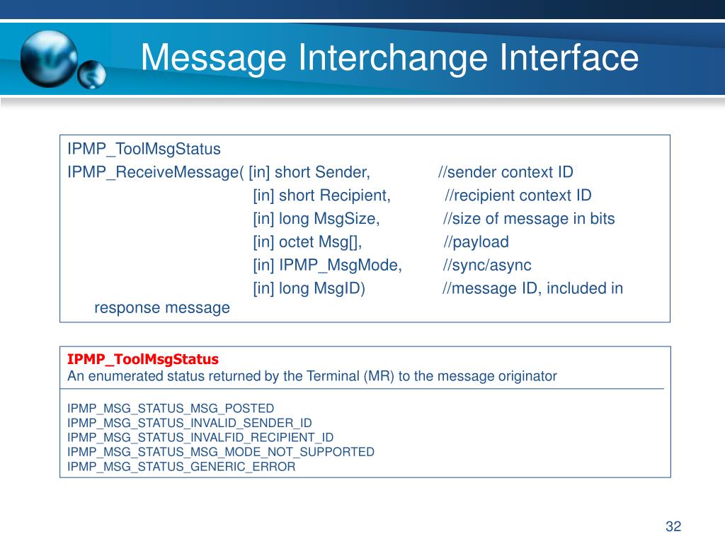 Message Interchange Interface IPMP_ToolMsgStatus IPMP_ReceiveMessage( [in] short Sender, //sender context ID [in] short Recipient, //recipient context ID [in] long MsgSize, //size of message in bits [in] octet Msg[], //payload [in] IPMP_MsgMode, //sync/async [in] long MsgID) //message ID, included in response message IPMP_ToolMsgStatus An enumerated status returned by the Terminal (MR) to the message originator IPMP_MSG_STATUS_MSG_POSTED IPMP_MSG_STATUS_INVALID_SENDER_ID IPMP_MSG_STATUS_INVALFID_RECIPIENT_ID IPMP_MSG_STATUS_MSG_MODE_NOT_SUPPORTED IPMP_MSG_STATUS_GENERIC_ERROR