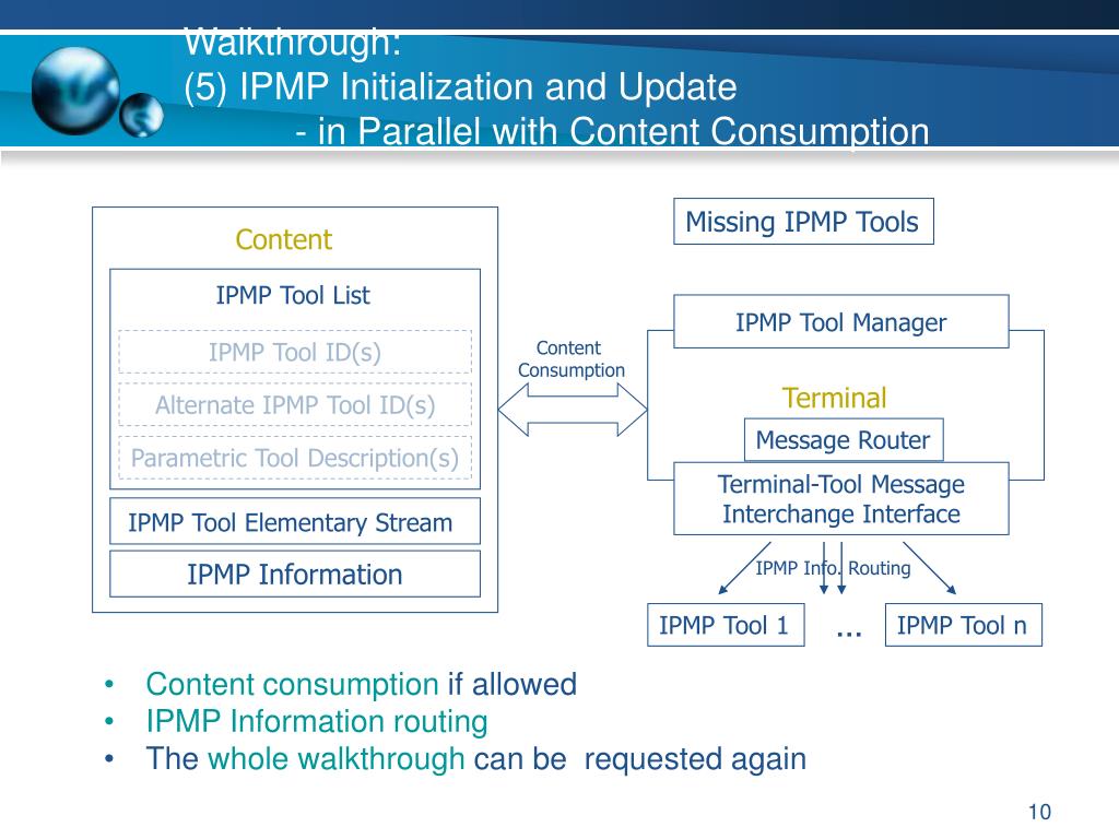 Content IPMP Tool List Content Consumption IPMP Tool Manager IPMP Tool ID(s) Terminal Alternate IPMP Tool ID(s) Parametric Tool Description(s) Terminal-Tool Message Interchange Interface IPMP Tool Elementary Stream IPMP Info. Routing IPMP Information Walkthrough:(5) IPMP Initialization and Update - in Parallel with Content Consumption • Content consumption if allowed • IPMP Information routing • The whole walkthrough can be requested again Missing IPMP Tools Message Router IPMP Tool 1 … IPMP Tool n