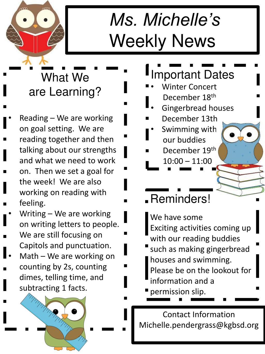 Ms. Michelle’s Weekly News • Important Dates • Winter Concert • December 18th • Gingerbread houses December 13th • Swimming with • our buddies • December 19th • 10:00 – 11:00 • What We • are Learning? • Reading – We are working on goal setting. We are reading together and then talking about our strengths and what we need to work on. Then we set a goal for the week! We are also working on reading with feeling. • Writing – We are working on writing letters to people. We are still focusing on Capitols and punctuation. • Math – We are working on counting by 2s, counting dimes, telling time, and subtracting 1 facts. Reminders! We have some Exciting activities coming up with our reading buddies such as making gingerbread houses and swimming. Please be on the lookout for information and a permission slip. Contact Information Michelle.pendergrass@kgbsd.org