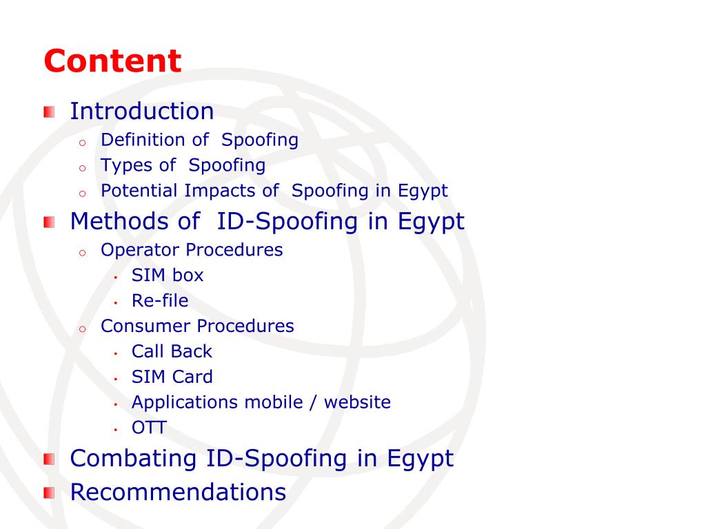 Content • Introduction • Definition of Spoofing • Types of Spoofing • Potential Impacts of Spoofing in Egypt • Methods of ID-Spoofing in Egypt • Operator Procedures • SIM box • Re-file • Consumer Procedures • Call Back • SIM Card • Applications mobile / website • OTT • Combating ID-Spoofing in Egypt • Recommendations