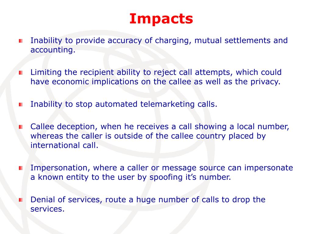 Impacts • Inability to provide accuracy of charging, mutual settlements and accounting. • Limiting the recipient ability to reject call attempts, which could have economic implications on the callee as well as the privacy. • Inability to stop automated telemarketing calls. • Callee deception, when he receives a call showing a local number, whereas the caller is outside of the callee country placed by international call. • Impersonation, where a caller or message source can impersonate a known entity to the user by spoofing it’s number. • Denial of services, route a huge number of calls to drop the services.