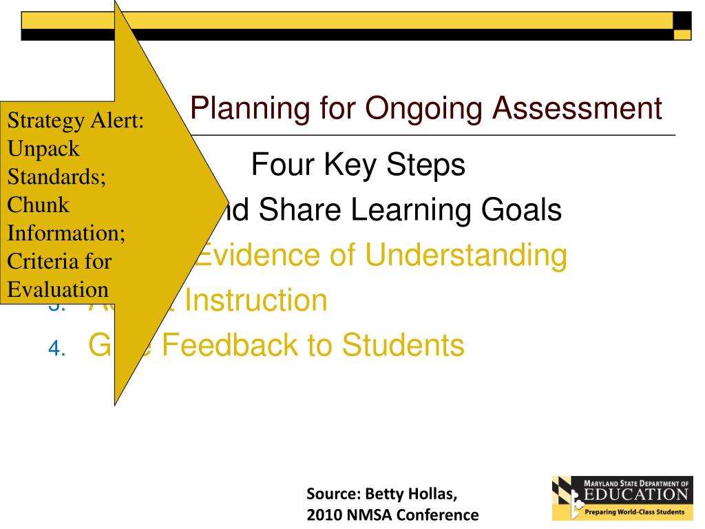 Strategy Alert: Unpack Standards; Chunk Information; Criteria for Evaluation Planning for Ongoing Assessment Four Key Steps • Identify and Share Learning Goals • Gather Evidence of Understanding • Adjust Instruction • Give Feedback to Students Source: Betty Hollas, 2010 NMSA Conference