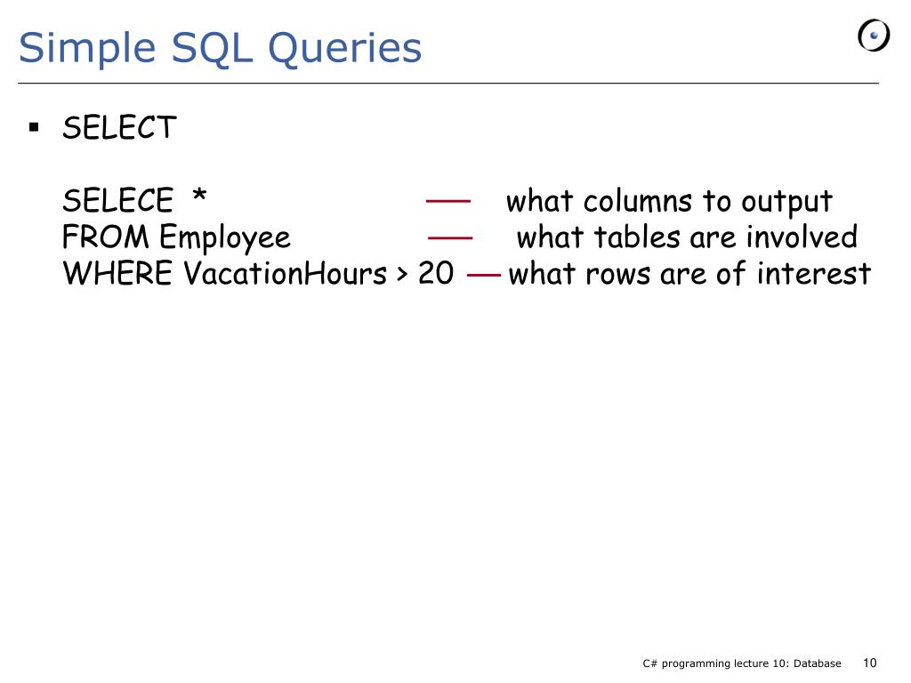 Simple SQL Queries • SELECTSELECE * what columns to output FROM Employee what tables are involvedWHERE VacationHours > 20 what rows are of interest C# programming lecture 10: Database 10
