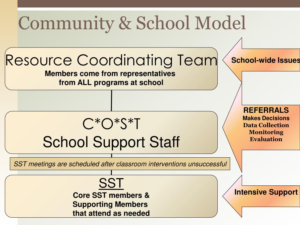 Community & School Model Resource Coordinating Team Members come from representatives from ALL programs at school C*O*S*T School Support Staff SST Core SST members & Supporting Members that attend as needed School-wide Issues REFERRALS Makes Decisions Data Collection Monitoring Evaluation SST meetings are scheduled after classroom interventions unsuccessful Intensive Support