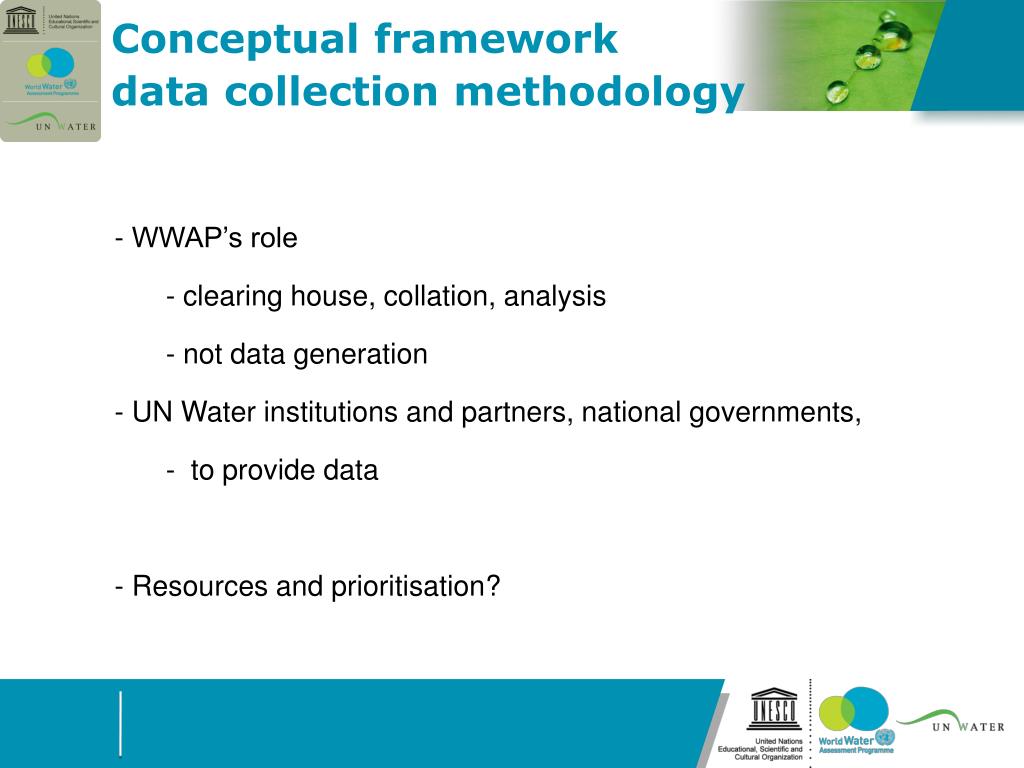 WWAP’s role • clearing house, collation, analysis • not data generation • UN Water institutions and partners, national governments, • to provide data • Resources and prioritisation? Conceptual framework data collection methodology