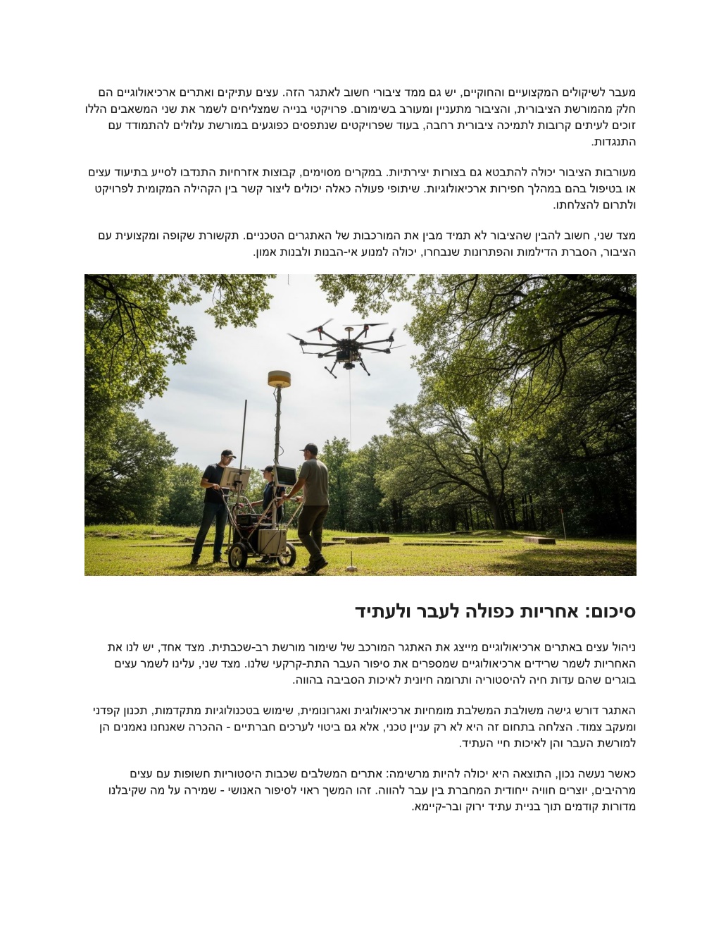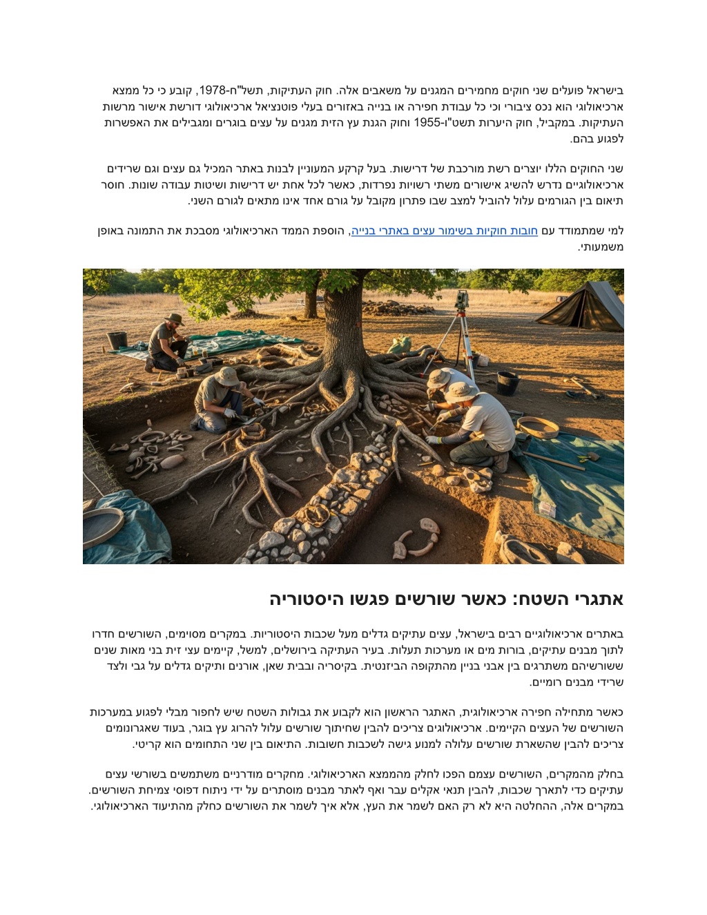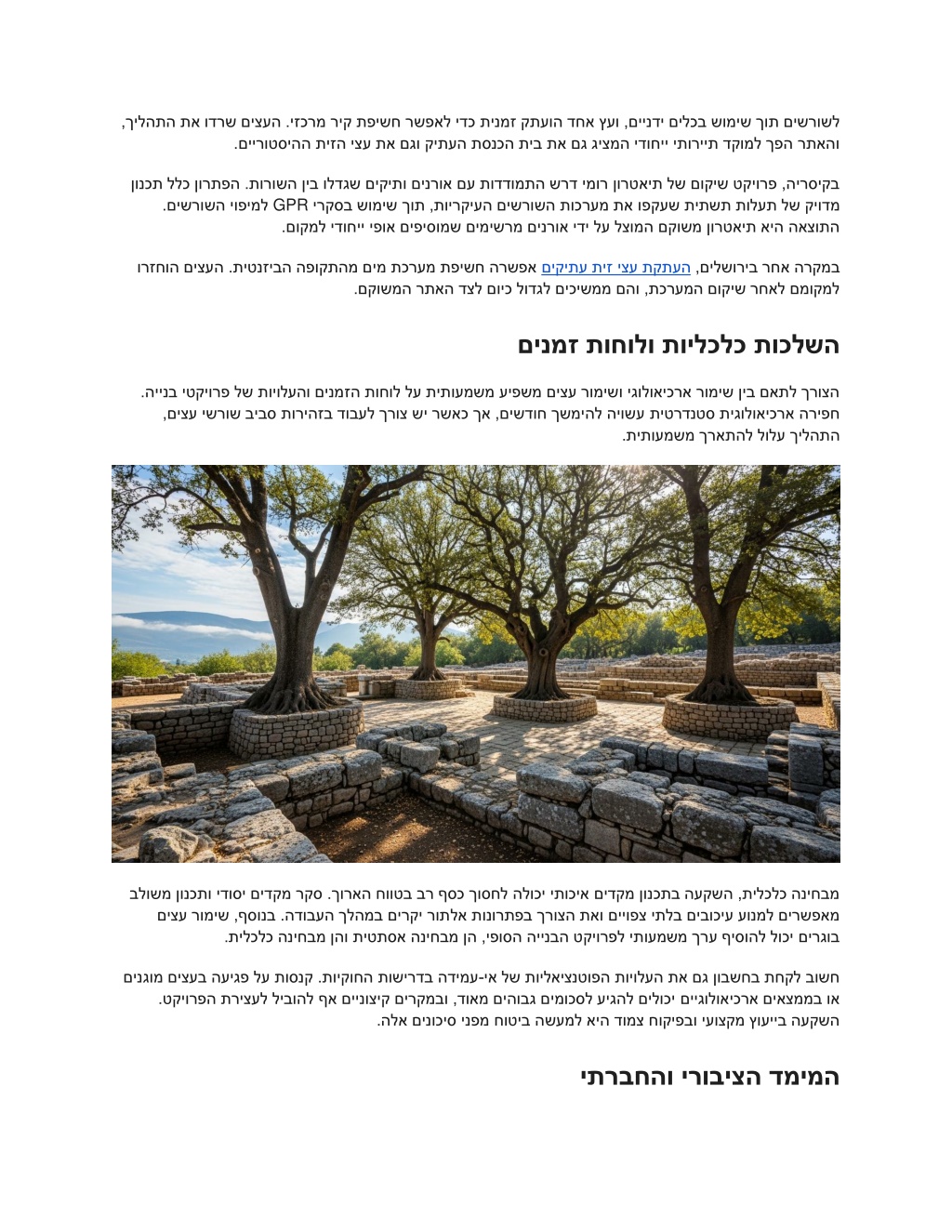 רגתאה :היינבב םיצע לוהינו םייגולואיכרא םירתא תשרומ רומיש לש לופכה םג ליבקמב רמשל דציכ :ידחיי רגתא ררועתמ ,ןימוי יקיתע םירוזאב דחוימב ,לארשיב הינב טקיורפ םיננכתמ רשאכ לש תונוש תובכש םיגציימ הלא תורצוא ינש ?רתאב םילדגה םירגוב םיצע םגו םייגולואיכרא םיאצממ הירוטסיה - דחאה םילוקישהו תיעוצקמה תוירחאה ,תויקוחה תושירדה ןיב טווינה .קוחב םינגומ םהינשו .םימוחתה ינש לש הקימעמ הנבהו קיודמ ןונכת שרוד םייתביבסה הילעמ ינשהו המדאל תחתמ - לעה תוחכונל יעקרק - תיעקרק תתה רבעה ןיב שגפמה - ,תוקיתע םירע יזכרמב דחוימב ,הינבל הריפח תלועפ לכב טעמכ .דחוימב תוירוטסיה תופוקתל םידע םמצעב םה הלא םירוזאב םיבר םיצע ,ליבקמב .םייגולואיכרא םידירש אוצמל תורשפא תמייק .המדאה קמועל םיגרתשמ םהישרושש םיקיתו םינרואו םינש תואמ םיבורח ,םיקיתע תיז יצע רישע יגולואיכרא רבע תלעב ץרא איה לארשי תונוש - ףא םיתיעלו ,תויגולואיכראה תובכשל םירדוח םיצעה ישרוש .תושגפנ וללה תוכרעמה יתש רשאכ הליחתמ ה תכרעמב עוגפל לולעש המ ,המדאה תובכשל השיג תשרוד תיגולואיכרא הריפח ,ינש דצמ .םיקיתע םיאצממ םיפטוע אשמה ינש תא רמשל ךיא :תבכרומ המליד איה האצותה .םירגוב םיצע לש םישרושה ?הלאה םיבושחה םיב יעבה םיננכתמ רשאכ םדקומה ןונכ תה .םייגולואיכראה םילוקישה תא שארמ בלשל ינויח , היינב ירתאב ימונורגא חוקיפ .םיבאשמה ינש לע םירמושש םייתריצי תונורתפ אוצמל רשפאמ םירימחמ םיקוח ינש :תיקוחה תרגסמה
