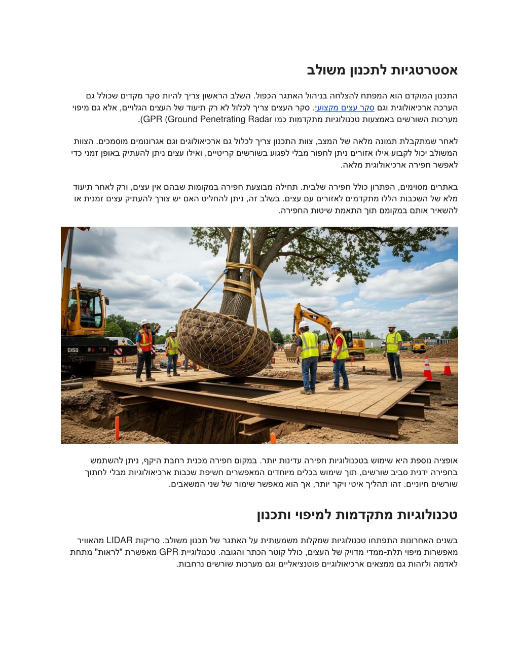בלושמ ןונכתל תויגטרטסא םג ללוכש םידקמ רקס תויהל ךירצ ןושארה בלשה .לופכה רגתאה לוהינב החלצהל חתפמה אוה םדקומה ןונכתה יופימ םג אלא ,םייולגה םיצעה לש דועית קר אל לולכל ךירצ םיצעה רקס . GPR (Ground Penetrating Radar .) םגו תיגולואיכרא הכרעה יעוצקמ םיצע רקס ומכ תומדקתמ תויגולונכט תועצמאב םישרושה תוכרעמ תווצה .םיכמסומ םימונורגא םגו םיגולואיכרא םג לולכל ךירצ ןונכתה תווצ ,בצמה לש האלמ הנומת תל ידכ ינמז ןפואב קיתעהל ןתינ םיצע וליאו ,םייטירק םישרושב עוגפל ילבמ רופחל ןתינ םירוזא וליא עובקל לוכי בלושמה בקתמש רחאל .האלמ תיגולואיכרא הריפח רשפאל דועית רחאל קרו ,םיצע ןיא םהבש תומוקמב הריפח תעצובמ הליחת .תיבלש הריפ וא תינמז םיצע קיתעהל ךרוצ שי םאה טילחהל ןתינ ,הז בלשב .םיצע םע םירוזאל םימדקתמ וללה תובכשה לש אלמ ח ללוכ ןורתפה ,םימיוסמ םירתאב .הריפחה תוטיש תמאתה ךות םמוקמב םתוא ריאשהל שמתשהל ןתינ ,ףקיה תבחר תינכמ הריפח םוקמב .רתוי תונ ךותחל ילבמ תויגולואיכרא תובכש תפישח םירשפאמה םידחוימ םילכב שומיש ךות ,םישרוש ביבס תינדי הריפחב .םיבאשמה ינש לש רומיש רשפאמ אוה ךא ,רתוי רקיו יטיא ךילהת והז .םיינויח םישרוש ידע הריפח תויגולונכטב שומיש איה תפסונ היצפוא ןונכתו יופימל תומדקתמ תויגולונכט LIDAR תוקירס .בלושמ ןונכת לש רגתאה לע תיתועמשמ תולקמש תויגולונכט וחתפתה תונורחאה םינשב תייגולונכט .הבוגהו רתכה רטוק ללוכ ,םיצעה לש קיודמ ידממ GPR תחתמ "תוארל" תרשפאמ ישרוש תוכרעמ םגו םיילאיצנטופ םייגולואיכרא םיאצממ םג תוהזלו המדאל .תובחרנ ם ריוואהמ תלת יופימ תורשפאמ -