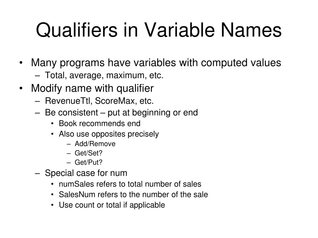 Qualifiers in Variable Names • Many programs have variables with computed values • Total, average, maximum, etc. • Modify name with qualifier • RevenueTtl, ScoreMax, etc. • Be consistent – put at beginning or end • Book recommends end • Also use opposites precisely • Add/Remove • Get/Set? • Get/Put? • Special case for num • numSales refers to total number of sales • SalesNum refers to the number of the sale • Use count or total if applicable